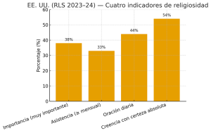 Importancia de la religión: ~40% de los adultos en EE. UU. dicen que la religión es “muy importante” en su vida. Pew Research Center